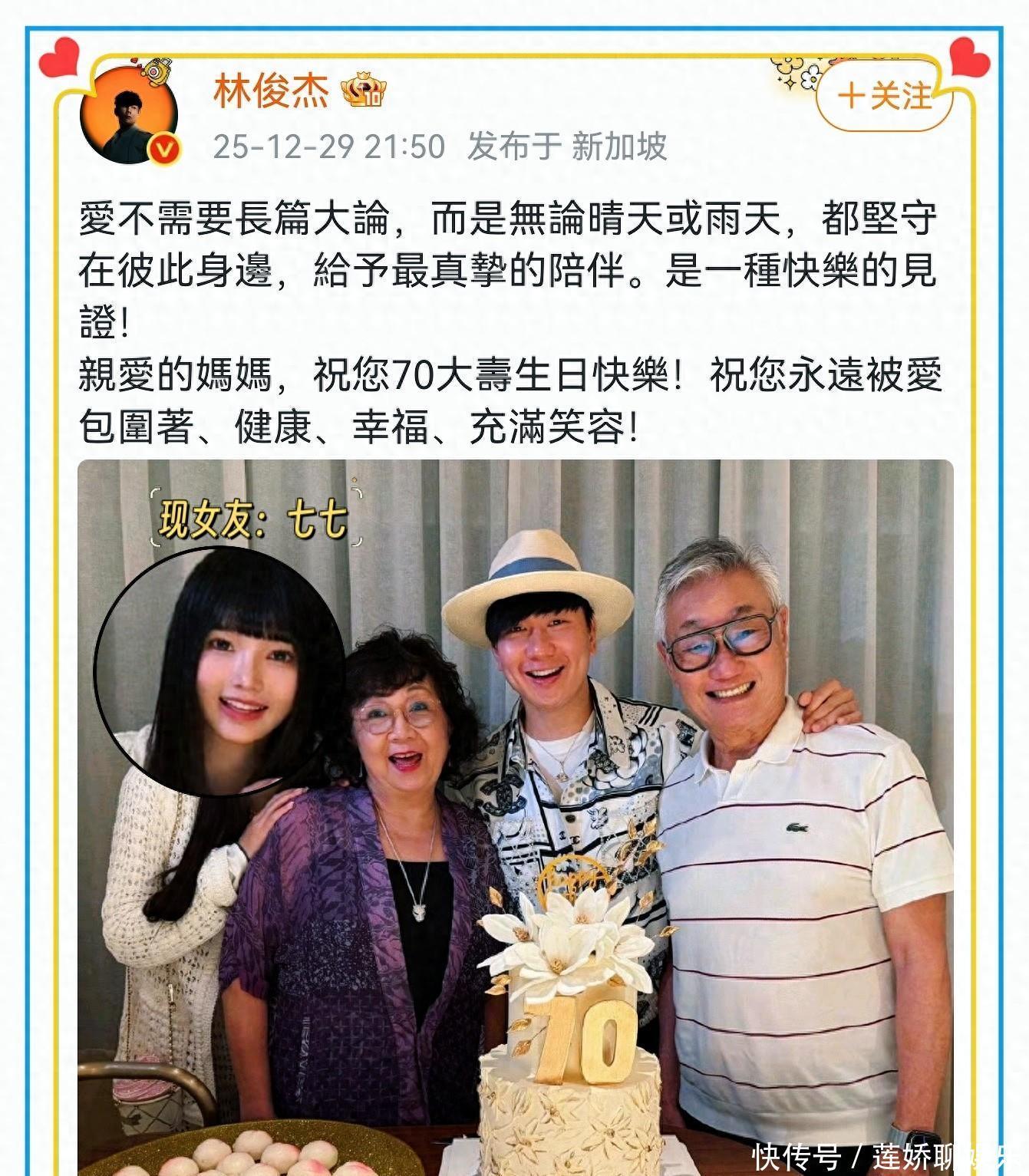2025年12月29日,林俊杰在社交平台为母亲庆祝七十岁生日并晒出了现女友七七共同为妈妈庆生的照片,林俊杰变相官宣了女友七七。